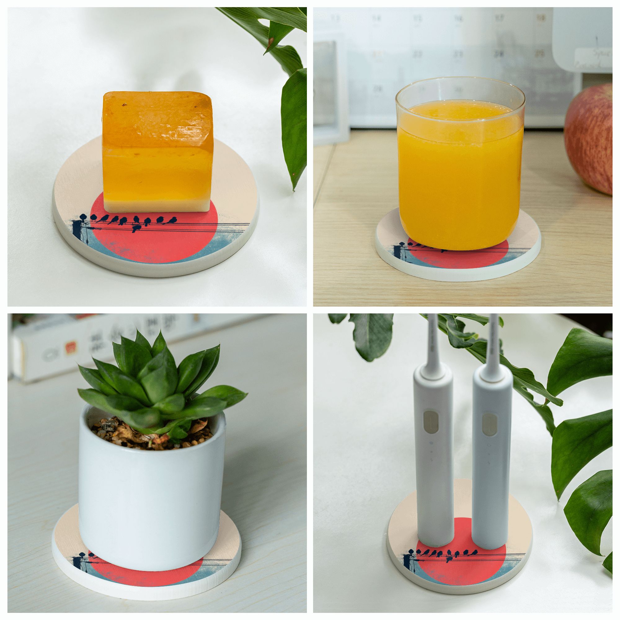 4" Minimalist Birds on Wire with Red Sun Diatomite Round Coaster – Absorbent, Quick-Dry, Heat-Resistant, Eco-Friendly Cup Mat